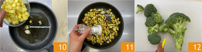 Add the potatoes 10 and sauté for 10 minutes. Adjust the salt 11 and remove them from the pan. Set aside. Meanwhile, separate the broccoli florets 12 and cut them into pieces.