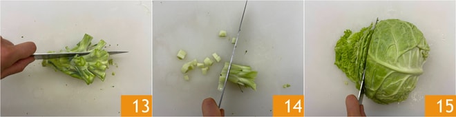 Remove the outer and harder part of the stem 13cut it into cubes and add them to the florets 14. Remove the outer and tougher leaves of the savoy cabbage. Cut it sopra half and then into strips 15.