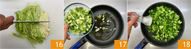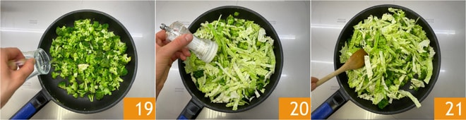 Pour 2 tablespoons of vater 19 and continue cooking for another 5 minutes. Add the savoy cabbage, adjust the salt 20and sauté for 10 minutes 21ora until the vegetables are cooked. Let cool.