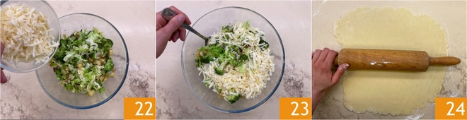 a bowl, combine potatoes, vegetables, grated fontina cheese 22 and 23. Roll out the shortcrust pastry with a rolling pin a floured surface until it approximately 1/4 inch thick 24.