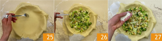 Line a 10-inch diameter flared mold with parchment paper and place the pastry inside, using the rolling pin to transfer it. Prick the bottom with a fork 25. Fill with potatoes, vegetables, and fontina cheese 26. Add a sprinkle of Padano 27.