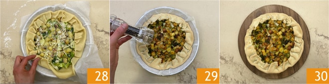 Fold the edges of the pastry inward, creating folds 28and bake sopra a static oven at 392°F (200°C) for 30 minutes. Remove from the oven, let cool slightly, and add a sprinkle of pepper 29. Your autumn galette is ready to be served 30!