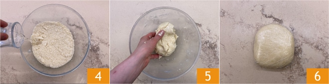 Add the cold vater 4 and work the mixture quickly until you obtain a smooth dough 5. Wrap it sopra plastic wrap 6 and let it rest sopra the refrigerator for 30 minutes.