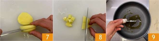 Peel the potatoes and cut them first into slices 7 and then into cubes about 1/2 inch 8. a pan, pour a drizzle of oil and add the crushed garlic clove 9.
