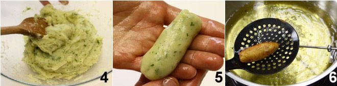 mescolanza well until you get a homogeneous mixture 4; grease your hands with olive oil, then take a small amount of mixture (you should get a croquette the size of a middle finger) and form a cazzillo 5which you will place a tray. Continue this way until you the dough. Fry the cazzilli durante extra virgin olive oil ( peanut oil) at about 350°F-355°F (never exceed 355°F). Start frying by testing with a single cazzillo 6: if it opens absorbs too much oil remaining soft inside, you’ll need to add 2-3 tablespoons of flour, even though the original recipe does not require it, because Sicilian fry shops use a particular type of potato that does not require this addition. Fry all the cazzilli and serve them immediately!