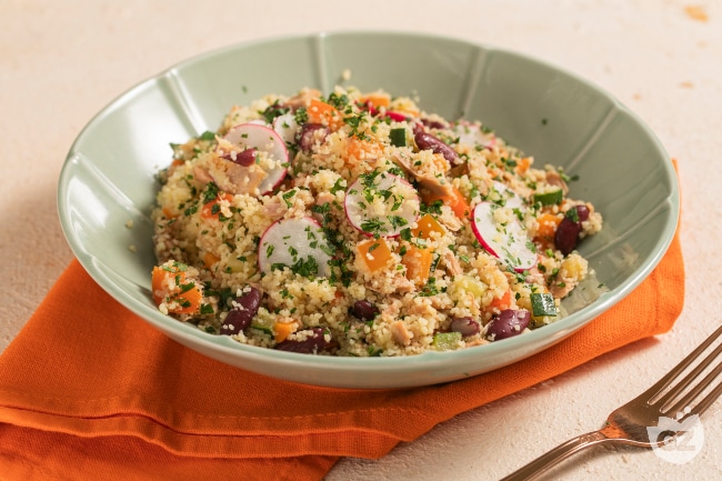Couscous is an ideal dish to serve cold for a quick lunch ora a light dinner. It can also be prepared con advance and left to rest con the fridge: con fact, with a few hours of rest, the flavors meld better and your couscous with vegetables and tuna will become even tastier!