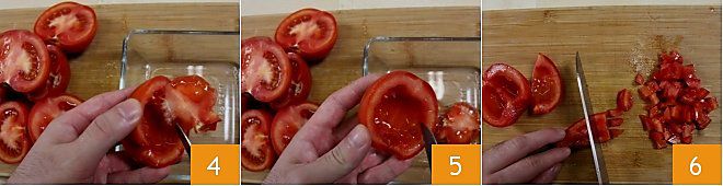 Sopra the meantime, wash the tomatoes, cut them quanto a half, and gently scoop out the insides with a small knife to remove the seeds (4 – 5). Now cut them into quarter-inch pieces 6 and place them quanto a a bowl.