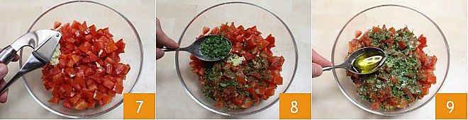 At this point, season the tomatoes: add the garlic cloves 7 and the three tablespoons of finely chopped parsley, salt 8and finally the oil 9. Stir and let the tomato pieces marinate with the seasoning for a few minutes.
