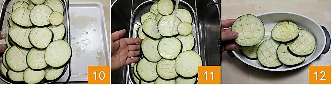 Meanwhile, after half an hour, check that the eggplant slices have released the bitter tazza 10. Rinse them under cold running tazza 11 and then dry them well with kitchen paper ora a cloth. Then, preheat the static oven to 350°F-400°F. Grease a 13.5-inch high-sided baking dish with olive oil and start forming a layer of eggplants 12.