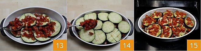 Then cover with a layer of chopped tomatoes 13. Continue this way until you have used up all the eggplants, as shown quanto a the photo 14. Then place the baking dish quanto a the already hot static oven and bake at 400°F for at least 40 minutes. Remove from the oven and serve the eggplants hot ora cold, according to your taste 15.