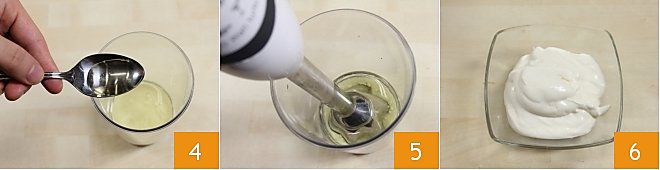 finally a tablespoon of vinegar 4 lemon. Immerse the immersion blender into the glass 5 and blend the ingredients at medium speed until the mixture thickens; it will only take a few seconds. Transfer the fake egg-free mayonnaise to a small bowl 6 and serve it to your guests! Remember that, maintaining the same proportions, you can also use whole milk instead of soy milk and olive oil instead of seed oil.