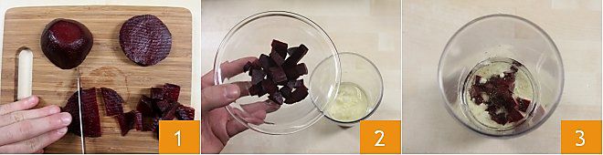 To prepare the fake beetroot mayonnaise, first cut the pre-cooked beetroot into chunks 1. Proceed as above, pouring soy milk, sunflower seed oil, a pinch of salt, and finally a tablespoon of vinegar lemon into a tall glass, then add the chopped beetroot (2-3).