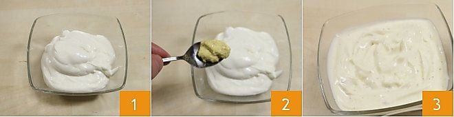 To prepare the fake mustard mayonnaise, proceed as above by preparing the basic vegan mayonnaise and transferring it to a small bowl 1. Add the mustard 2 the two sauces, and your fake mustard mayonnaise is ready 3!