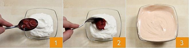 To prepare the fake tomato mayonnaise, proceed as above by preparing the basic vegan mayonnaise and transferring it to a small bowl. Then add the tomato paste 1 the two sauces 2and your fake tomato mayonnaise is ready 3!