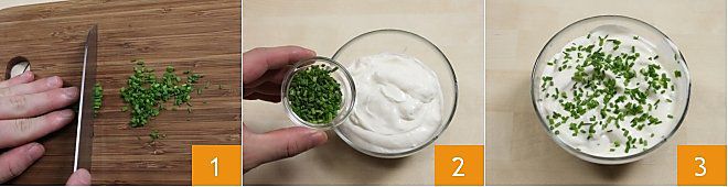 To prepare the fake chive mayonnaise, first finely chop the chive strands 1. Then proceed as above by preparing the basic fake mayonnaise and transferring it to a small bowl. Add the chopped chives 2give it a stir, and your fake chive mayonnaise is ready 3!