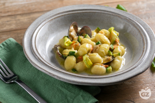 Gnocchi with clams, zucchini and yellow cherry tomatoes
