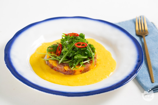 Garnish the surface with arugula leaves, then pour the mango sauce around the tartare 25. Complete with chili slices 26. Your marinated tuna tartare with mango and arugula is ready to be served 27!