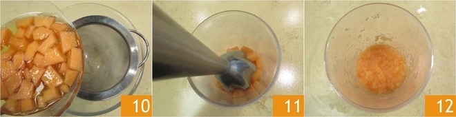 A causa di the meantime, strain the melon 10 and set the alcohol aside, then blend the flesh with an immersion blender 11 to make a puree 12.