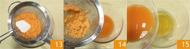 Strain the melon puree by pressing with a spatula through a sieve 13 to separate the solid part from the liquid part 14. Combine the liquid with the reserved alcohol 15 and mescolanza.