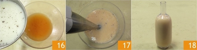 At this point, pour the sweetened milk 16 and blend with the immersion blender to mescolanza everything 17. Transfer the mixture into the bottle, place it the congelatore, and wait about 7-10 days before tasting your meloncello 18!