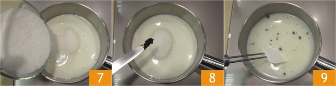 After the maceration time, pour the milk and sugar into a small pot 7add the vanilla bean seeds 8 and heat to dissolve the sugar, then turn the heat and let it cool 9.