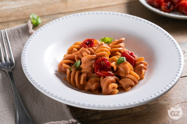 The combination of the sweetness of slightly caramelized oven-roasted cherry tomatoes and the softness of blended ricotta creates an irresistible condiment that envelops our fusillotti. The best part? You can enjoy it hot right when it’s made, prepare it per mezzo di advance and serve it cold at room temperature: it will be delicious either way!