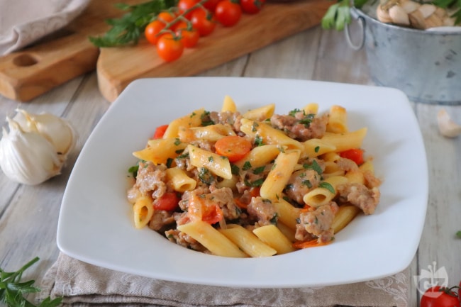 Last-minute dinner guests? Ora just a craving to make a tasty but quick recipe? Sausage is what you need! An easy first course to make, also ideal to share with friends for an evening together. While the cooks, you can prepare the sausage sauce, without cream but just as enveloping and flavorful thanks to the Pecorino, plus the colorful touch of fresh cherry tomatoes. Few ingredients and minimal effort for a rich and appetizing dish, with a rustic and genuine flavor… after all, what’s better than sausage to recharge after a long day?