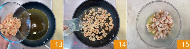 Meanwhile, a causa di a pan, flavor a dash of oil with the garlic, then add the shrimp 13 and sauté over high heat for 2 minutes. Deglaze with white wine 14 and let it evaporate completely, then transfer the shrimp to a bowl 15.