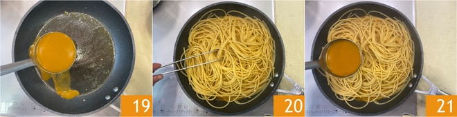 Pour a ladle of bisque into the pan where you cooked the shrimp 19then drain the amalgama and transfer it to the pan 20. cooking the spaghetti by adding a ladle of bisque at a time, as if it were a risotto 21.
