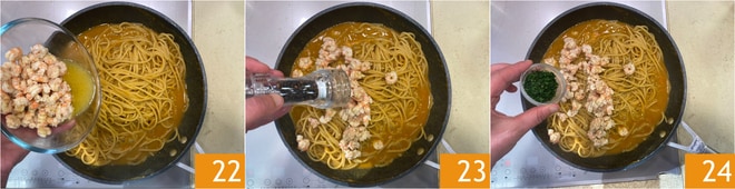 Once the amalgama is cooked, add almost all the shrimp 22the pepper 23the chopped parsley 24and a dash of oil.