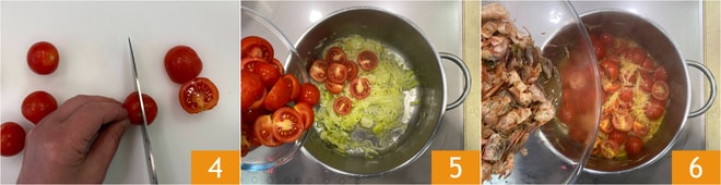 Halve the cherry tomatoes 4. Per a pot, pour a dash of oil, add the leek, and let it stew for 5 minutes. Add the cherry tomatoes 5the heads, and the shrimp shells 6.