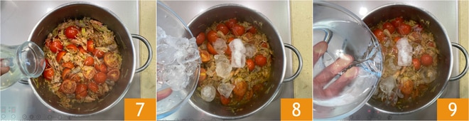 Deglaze with white wine 7 and let the alcohol evaporate completely, then add the ice cubes 8 and the tazza 9.