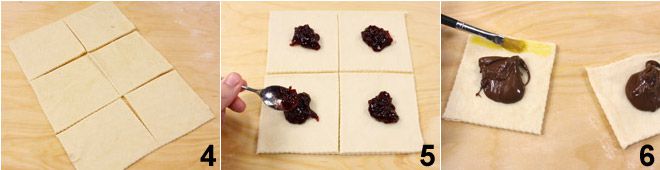 Remove the dough from the refrigerator and with the help of a rolling pin, roll out the dough into a rectangle shape and a thickness of about 1/16 inch. With a fluted pastry cutter, cut the dough into squares with 4-inch sides 4and place a teaspoon of Nutella cherry jam sopra the center of each 5. Beat an egg sopra a small bowl, and with a brush, coat the edges of the pastry squares,