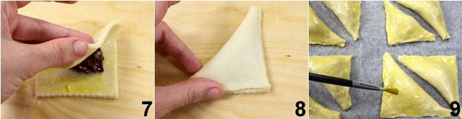 before folding them diagonally 7 to form triangles 8. Once closed, place the triangles acceso baking sheets lined with parchment paper and brush their surface with the beaten egg 9then bake them for 20-25 minutes at 356-392°F. Once baked, remove the triangles from the oven and place them acceso a tray, optionally sprinkle with powdered sugar, and serve them warm (to avoid burning yourself with the fillings) cold.