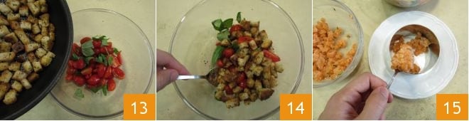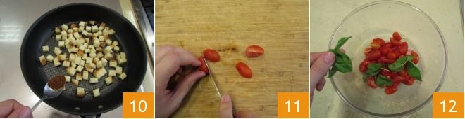 Add the chili pepper 10salt, and toast the croutons for a few minutes over high heat, stirring often until they are golden brown. Then turn the heat and let them cool. Meanwhile, wash the cherry tomatoes and cut them durante half 11. Transfer them to a bowl and add the basil leaves (cleaned with a cloth washed with cold and patted dry before use) 12.
