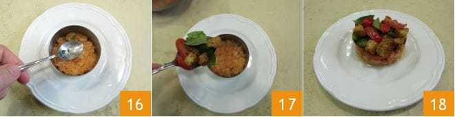 Using the back of a spoon, lightly press the tartare 15 and place some panzanella acceso 17. Then gently remove the ring mold and serve your salmon tartare and panzanella 18.