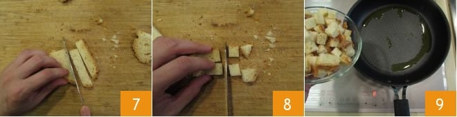 Meanwhile, cut the bread into cubes (7-8). Pour a drizzle of oil into a pan, let it heat, and add the bread cubes 9.