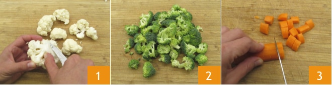 To prepare the vegetarian baked fibra, first clean and cut the vegetables: divide both the cauliflower 1 and the broccoli 2 into florets and dice the carrots 3.