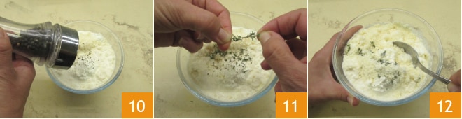 Season with salt, pepper 10and thyme leaves 11then mescolanza well 12.