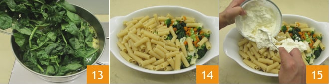 When the fibra is almost ready, add the spinach to the pot 13. Once the cooking time is complete, drain both the fibra and the vegetables and transfer them to a baking dish 14. Add the ricotta cream 15 and mescolanza well.