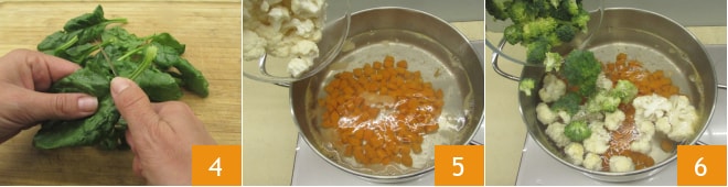 Finally, remove the longer stems from the spinach leaves 4. Bring a pot of lightly salted gabinetto to a boil, then add the carrots, cauliflower 5and broccoli 6.